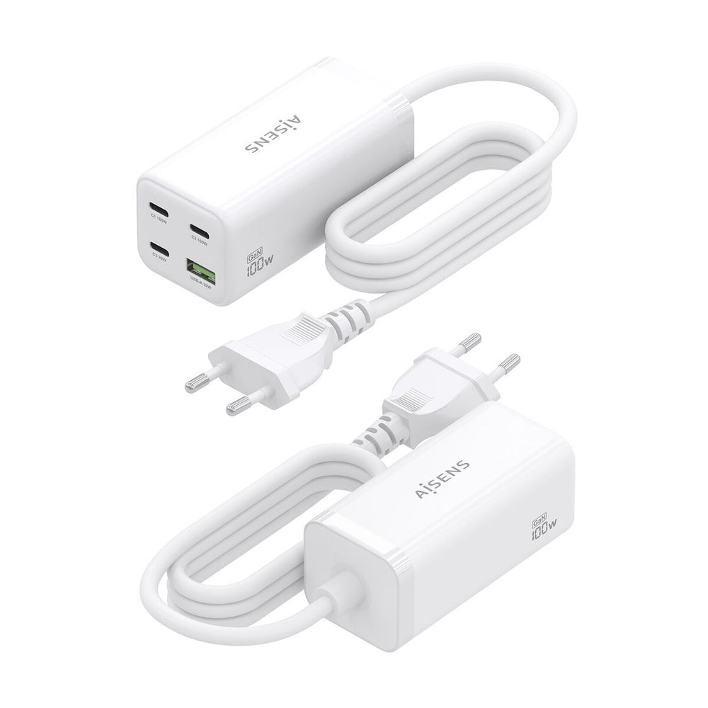 The Aisens 100W GaN Desktop Charger is a versatile and advanced device designed to optimize charging for multiple electronic devices. This high-power charger integrates GaN (gallium nitride) technology, allowing efficient and compact energy conversion, delivering up to 100 W of power in a small, lightweight format. It features a port combination including 3 USB-C outputs with PD3.0 support and compatibility with Quick Charge 4.0 and 5.0, plus 1 USB-A port with Quick Charge 3.0, ensuring fast and safe charging of smartphones, tablets, laptops, and other compatible devices. Its white design and sober appearance make it suitable for both home and office, while its connection via a dual power source, USB and mains, offers flexibility for different environments. The cable with a 1.4-meter length allows connection without space limitations. This universal wireless charger combines practicality and high technology, compatible with a wide range of devices supporting wireless and wired charging, ensuring maximum energy efficiency by reducing charging times. The integration of multiple fast charging protocols strengthens its profile as a multi-use accessory for users needing to charge several devices simultaneously without losing speed or safety. In summary, the Aisens 100W GaN desktop charger stands as a robust and modern solution to meet multifunctional charging demands in today’s digital environments.