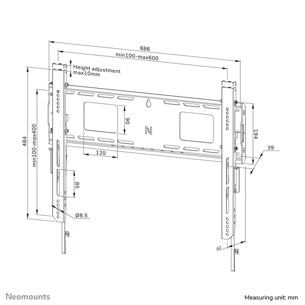 The Neomounts WL30-750BL16 is a fixed wall mount for TVs designed for large interactive screens, compatible with sizes from 42" to 86" and a maximum load capacity of 125 kg. This sturdy mount provides a secure and precise solution for heavy screens, featuring a high-profile wall plate that ensures stability even on uneven surfaces. The design includes adjustable depth brackets at the bottom to optimally distribute weight and guarantee maximum strength. It also offers individually height-adjustable arms up to 10 mm, allowing precise leveling or positioning of the screen. Its ultra-slim profile places the screen just 4.2 cm from the wall, giving the installation a discreet and elegant finish. This mount complies with the VESA standard from 100x100 to 600x400 mm, making it suitable for most professional and large-format screens. For cable management, it features a clever skid function for easy access to connectors and ports, along with various cutouts and holes for orderly cable and device attachment, contributing to a clean, professional setup. The quick-mount system with a connection plate simplifies both installation and safe removal of the screen, including a release mechanism that ensures ease and safety during handling. For added security, the mount allows installation of a padlock (not included) to prevent unauthorized tampering. As an optional accessory, a side AV bracket can be attached for storage or mounting of additional devices. The Neomounts WL30-750BL16 LEVEL combines advanced functionality, high weight capacity, and a carefully designed structure to provide a stable, secure, and professional touchscreen experience, ideal for environments requiring reliability and precision when installing large, heavy screens.